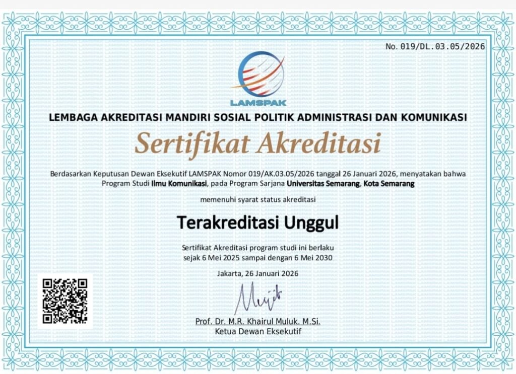 BERITASEMARANG.ID – Prestasi membanggakan kembali diukir oleh Universitas Semarang (USM). Program Studi S1 Ilmu Komunikasi (Ilkom) USM secara resmi berhasil meraih predikat Akreditasi Unggul dari Lembaga Akreditasi Mandiri Sosial, Politik, Administrasi, dan Komunikasi (LAMSPAK) pada tahun 2026 ini.