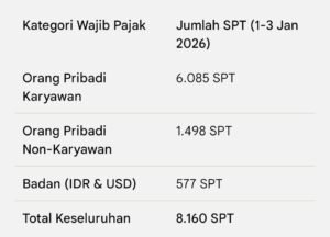 Berdasarkan data Direktorat Jenderal Pajak (DJP) hingga 3 Januari 2026 pukul 10.06 WIB, tercatat sebanyak 8.160 SPT Tahunan Tahun Pajak 2025 telah masuk. Angka ini mencerminkan kenaikan yang sangat kontras dibandingkan periode yang sama di tahun sebelumnya.