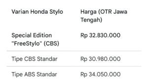 Daftar harga OTR (On The Road) untuk wilayah Jawa Tengah: