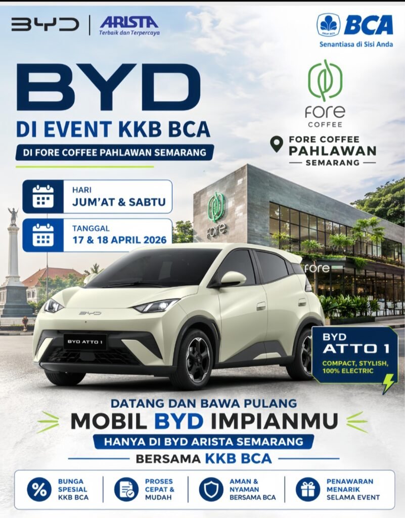 BERITASEMARANG.ID  – BYD Arista Semarang kembali menyapa konsumen setianya melalui ajang eksibisi eksklusif yang digelar di Fore Coffee Pahlawan, Semarang, pada Jumat dan Sabtu, 17-18 April 2026. ​