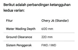 - Cek Rutin: Jika terpaksa melewati genangan tinggi, segera lakukan pemeriksaan di dealer resmi Chery untuk memastikan performa kendaraan tetap optimal.